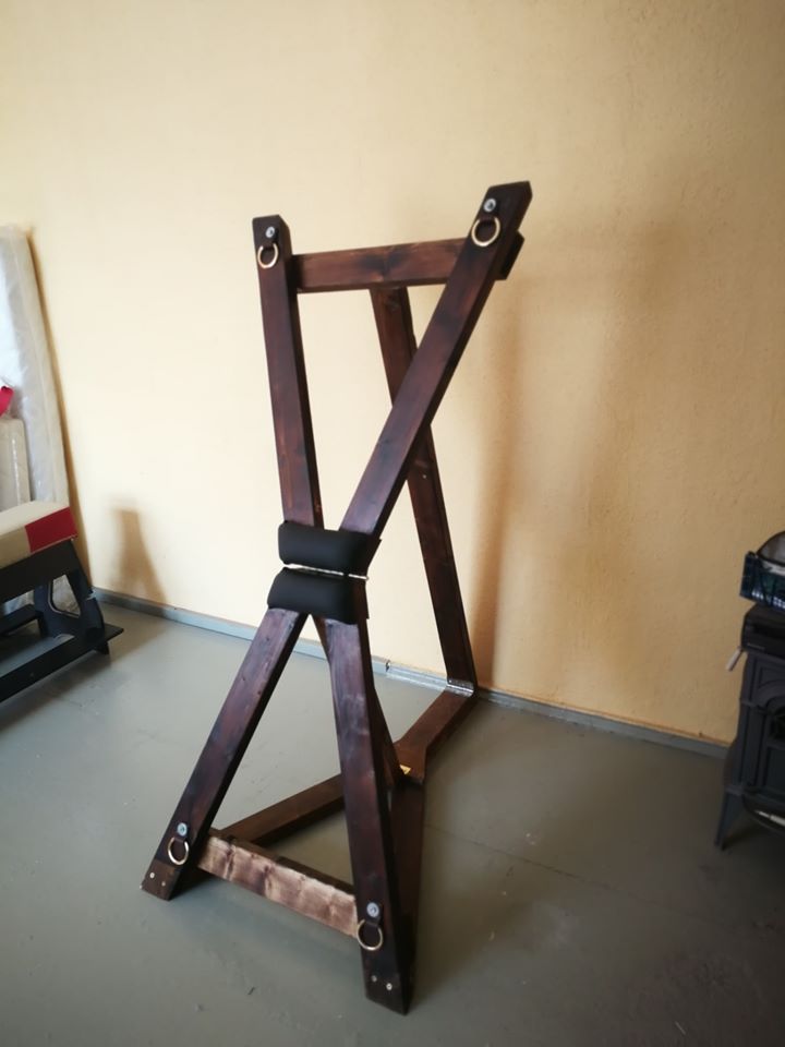 The Big X The Big X will be a special touch in your bedroom. It is a transformable three in one erotic furniture. All combinations are shown in the photos. We make it from natural wood – pine. The model is stained and lacquered, but can be ordered in black. In the form of a letter X, its height is 2m and its width 80cm. The support is covered with leather imitation, but can be made from natural leather.. Loop fixation in reinforced with natural leather loops. |